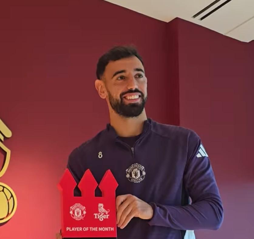 布魯諾-費(fèi)爾南德斯當(dāng)選曼聯(lián)9月最佳球員,當(dāng)選在卡靈頓訓(xùn)練基地領(lǐng)取了該獎(jiǎng)項(xiàng)。月隊(duì)員