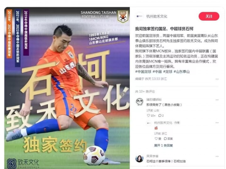 直播吧10月16日訊 杭州某MCN公司官宣與泰山球員石柯完成簽約。簽約