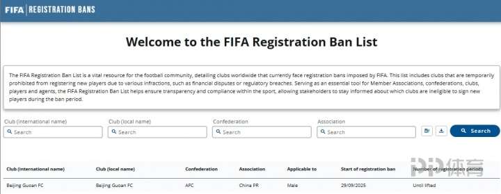FIFA官方消息,官方國(guó)安國(guó)際足聯(lián)注冊(cè)禁令披露系統(tǒng)9月29日公布新增北京國(guó)安一條禁令,新增新禁令為無(wú)限期直至案件解決。無(wú)限在解決前北京國(guó)安將不能操作國(guó)際國(guó)內(nèi)轉(zhuǎn)會(huì),期轉(zhuǎn)以及注冊(cè)新球員。冊(cè)禁