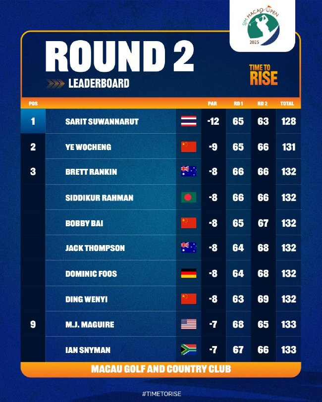 許安迪(70-71)、兩屆澳門公開賽冠軍張連偉(73-71)、業(yè)余球手王浩一(72-72)、業(yè)余球手夏楚沐(75-70)、前亞巡賽獎金王梁文沖(72-73)、薛涵(70-76)、陳逸龍(73-75)、業(yè)余小將李贄(76-73)、張梓洪(75-76)、業(yè)余球手楊明源(82-72)均被淘汰出局。南辰祐則退出了比賽。