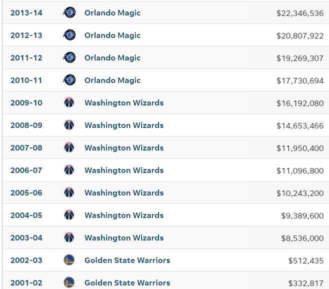 阿里納斯的才時參加吃壯NBA薪資列表,生涯薪資總額1.6億美元