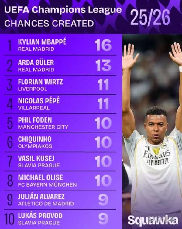 歐冠聯(lián)賽階段第三輪的本賽并列比賽全部結(jié)束。Squawka數(shù)據(jù)統(tǒng)計本賽季歐冠創(chuàng)造機會榜,季歐姆巴佩、冠創(chuàng)居萊爾前二,造機維爾茨并列第三。姆巴